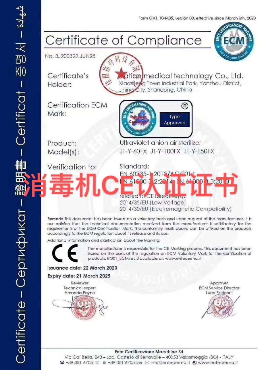 佳田醫(yī)療科技紫外線負(fù)離子消毒機(jī)現(xiàn)已取得CE認(rèn)證證書,可出口歐盟國家,為抗擊全球疫情做出一份貢獻(xiàn)!